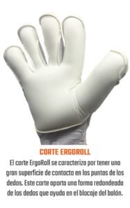 Gran superficie de contacto redondeada para abarcar más balón. FINGERTIP en las puntas de los dedos. Capa de textil Mesh entre los dedos para una mayor adaptación y ventilación. Guante montado en corte Ergoroll con envoltura de látex en el pulgar.