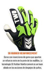 Dorso reforzado en las zonas de impacto Incrustaciones de goma situadas estratégicamente en el dorso para mitigar el impacto y potenciar los despejes de puños. Dorso de neopreno que se ajusta a la mano como una segunda piel.