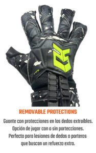 Refuerzo de látex en las zonas de impacto. Planchas de látex situadas estratégicamente en el dorso para mitigar el impacto y potenciar los despejes de puños.