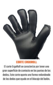 Gran superficie de contacto redondeada para abarcar más balón.Capa de textil Mesh entre los dedos para una mayor adaptación y ventilación. Guante montado en corte Ergoroll con envoltura de látex en el pulgar.