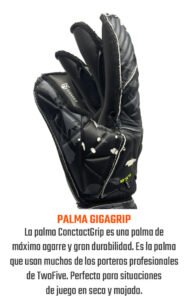 Palma de máximo rendimiento suministrada a nuestros porteros patrocinados para competir en ligas profesionales.Palma de competición con el mejor agarre en cualquier condición climática. 4mm látex German GigaGrip + 4mm foam. Sensación de agarre esponjoso. Gel interno Anti-Slip para aumentar el tacto con el balón y limitar los micro-movimientos de la mano dentro del guante.