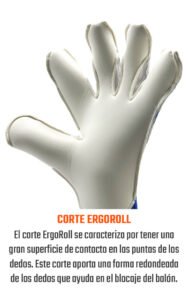 Gran superficie de contacto redondeada para abarcar más balón. FINGERTIP en las puntas de los dedos. Capa de textil Mesh entre los dedos para una mayor adaptación y ventilación. Guante montado en corte Ergoroll con envoltura de látex en el pulgar.
