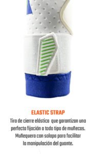 Tira elástica opcional con dos puntos de anclaje. Muñequera elástica que se ajusta perfectamente al contorno de la muñeca. Incluye tira de cierre de vuelta completa, opcional para los porteros que deseen mayor ajuste.