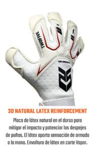 Dorso reforzado en las zonas de impacto. Planchas de látex situadas estratégicamente en el dorso para mitigar el impacto y potenciar los despejes de puños. Cuerpo de látex en el dorso que se ajusta a la mano dando seguridad y una sensación de armado.