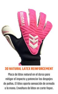 Refuerzo de látex en las zonas de impacto. Planchas de látex situadas estratégicamente en el dorso para mitigar el impacto y potenciar los despejes de puños.