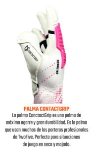 Palma de máximo rendimiento suministrada a nuestros porteros patrocinados para competir en ligas profesionales. Palma de competición con el mejor agarre en cualquier condición climática. 3.5mm látex German ContactGrip + 4mm foam. Sensación de agarre firme. Gel interno Anti-Slip para aumentar el tacto con el balón y limitar los micro-movimientos de la mano dentro del guante.
