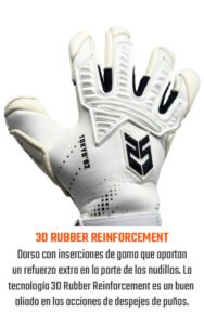 Dorso reforzado en las zonas de impacto Incrustaciones de goma situadas estratégicamente en el dorso para mitigar el impacto y potenciar los despejes de puños. Dorso de neopreno que se ajusta a la mano como una segunda piel.