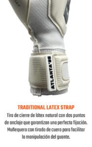 Tira de látex tradicional con dos puntos de anclaje y de vuelta completa. Muñequera con tirador para facilitar la manipulación del guante.